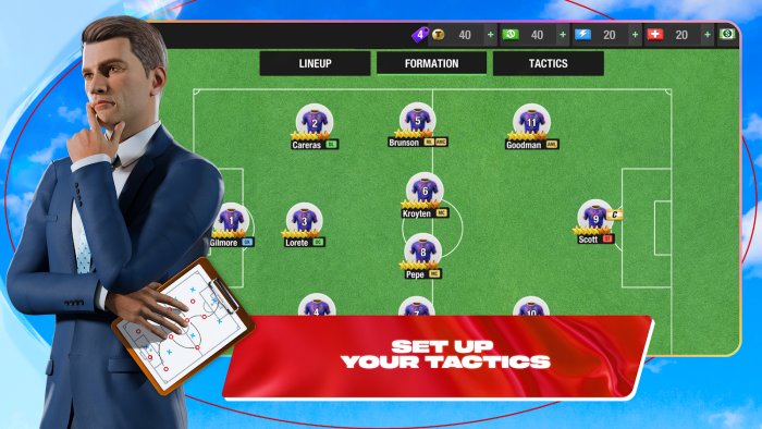Еще на старте раскрываются ключевые задачи в TE: и новичкам, и фанатам жанра предстоит создать и развивать футбольный клуб: выбирать форму команды, назначать стартовый состав, заниматься тренировками, проводить трансферы и заключать контракты с местными звездами. В рамках сезона клуб участвует в лигах, кубках и плей-офф турнирах – результаты матчей зависят как от показателей футболистов, так и от выбранной тактики, расстановки и тренировочного режима.