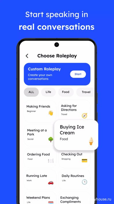 - 200+ сценариев разговоров: встроенные тематические диалоги по различным жизненным темам, которые помогают развивать уверенность в речи;