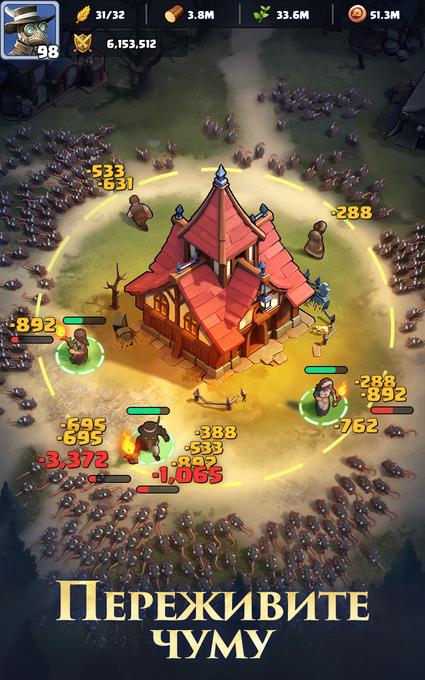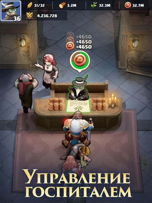 - Героическая система: наем и прокачка десятков персонажей с уникальными навыками, влияющими как на бой, так и на скорость развития поселения;